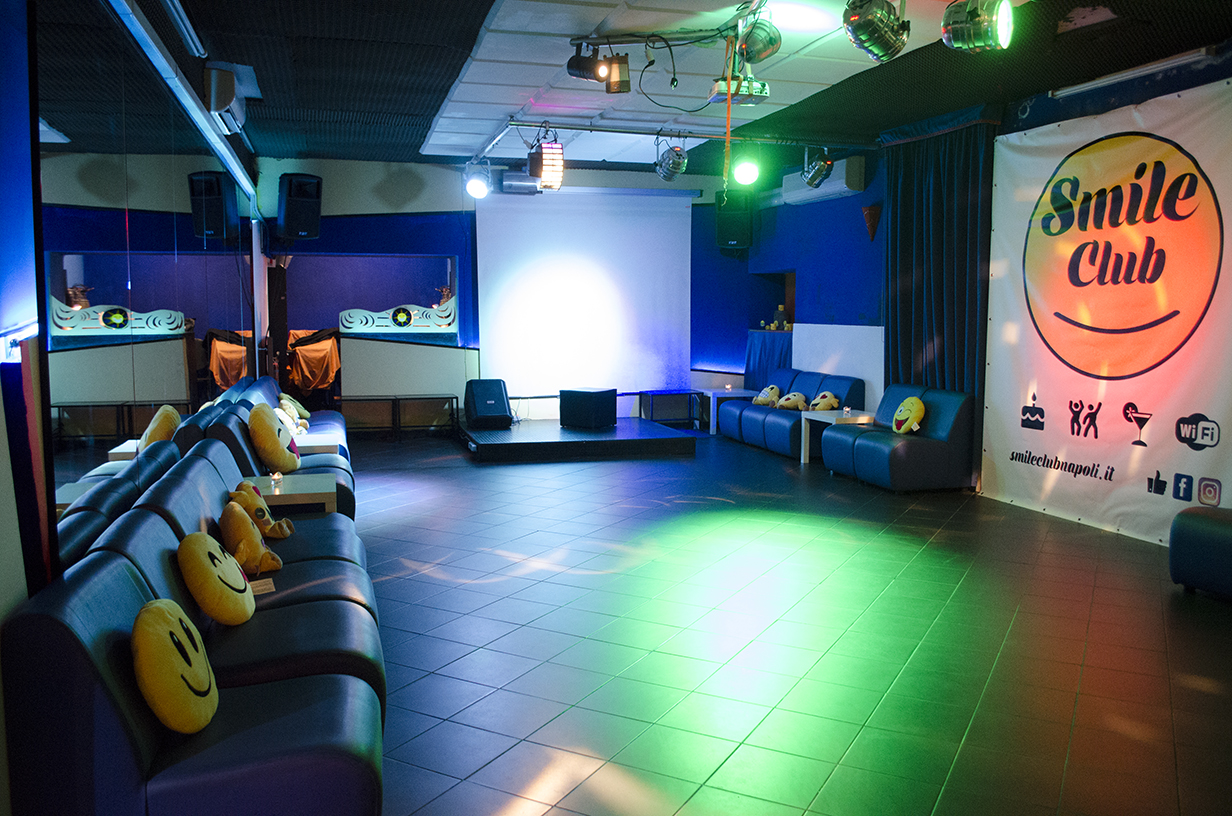 L‘associazione culturale ‘O sole ‘e notte promuove il progetto Smile Club nel cuore del Vomero (NA). In un’atmosfera moderna accompagnata da un ambiente elegante, Smile Club si propone per ogni tipologia di festa ed evento privato. Non solo: per gli associati al club si realizzano serate spettacolo con protagonisti diversi artisti della musica e del cabaret. Non mancheranno serate gioco con giochi da tavolo e di carte.